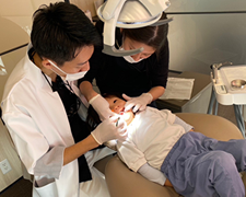 むし歯の治療のときだけに、歯医者に連れていくと、子どもは「歯医者は痛いことをされる場所だ」と感じ歯医者が怖くなります。しかし、当園では月に2回前後、当法人の歯科医院でお子さまに実際にチェアに座っていただいてむし歯健診やフッ素塗布などを行っており、歯医者のチェアに座り慣れているお子さまが殆どです。